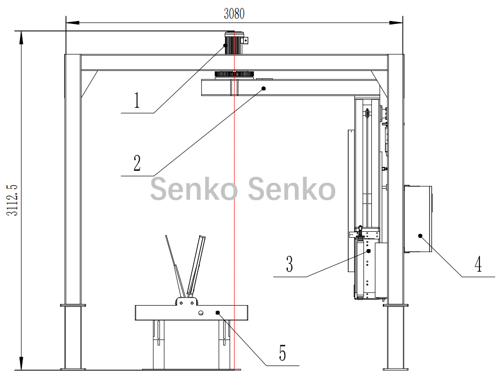 | 1، المحرك الدوار | 2، رف دوار | 3، رف الرفع | 4، خزانة التحكم الإلكترونية | 5، قاطع الفيلم |