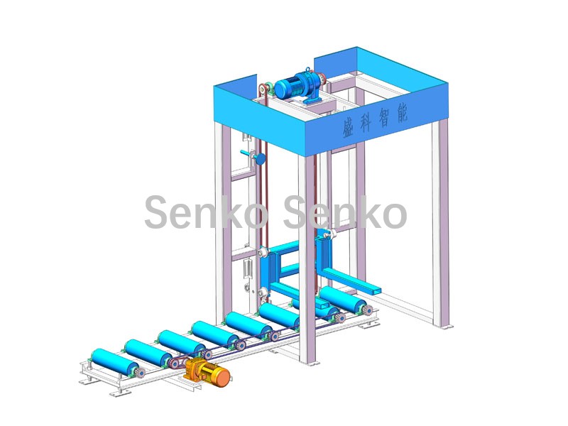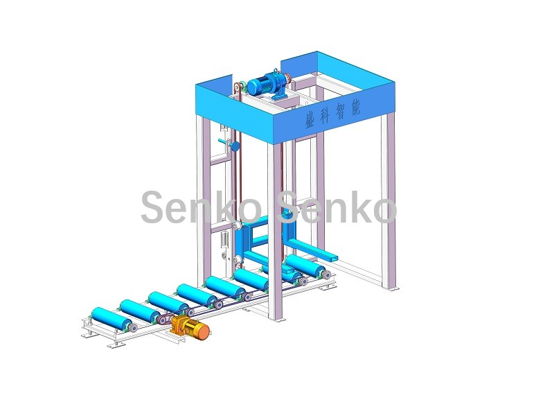 تُنقل ألواح الطوب التي تحملها الرافعة الشوكية، كل منصة محملة بالطوب/الكتل المُعالجة، إلى منطقة رفع المنصات. ترفع آلة الرفع منصات الطوب طبقةً طبقةً، من الأمام والخلف، من الأعلى إلى الأسفل، ثم تُرسلها إلى الناقل قبل فصل الطوب/الكتل عن المنصات.