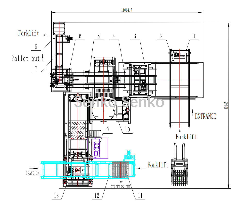 | 11.صينية تكديس الطوب/الكتل | 12. مستقبل المكدس | 13. آلة التكديس الرئيسية |