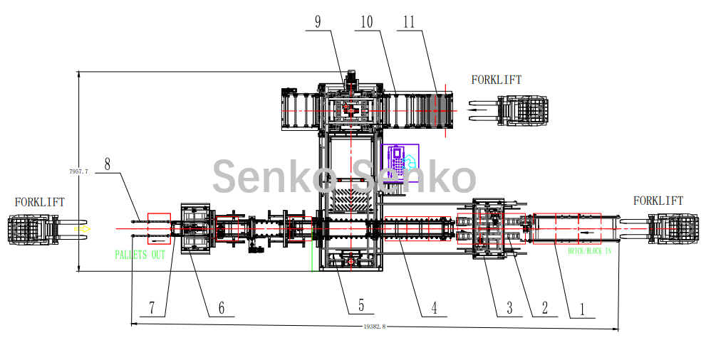 تُنقل ألواح الطوب التي تحملها الرافعة الشوكية، كل منصة محملة بالطوب/الكتل المُعالجة، إلى منطقة رفع المنصات. ترفع آلة الرفع منصات الطوب طبقةً طبقةً، من الأمام والخلف، من الأعلى إلى الأسفل، ثم تُرسلها إلى الناقل قبل فصل الطوب/الكتل عن المنصات.