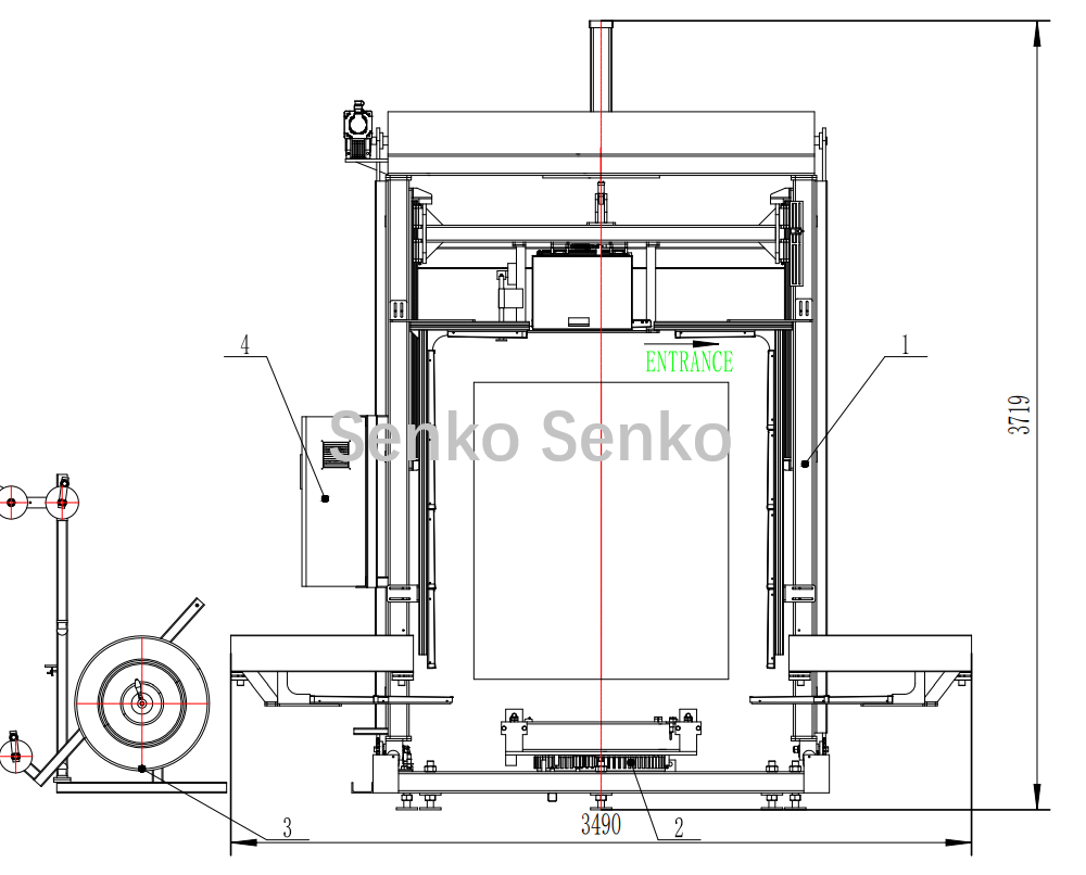 ينزلق رأس التعبئة وفتحة الرافعة على الإطار العرضي ذهابًا وإيابًا، مما يُثبّت ويُغلّف كومة الطوب مرارًا وتكرارًا بشريط بلاستيكي من مادة البولي إيثيلين تيرفثالات (PET). بعد ذلك، تُدير آلية الدوران السفلية كومة الطوب/الكتلة بزاوية 90 درجة، ويستمر رأس التعبئة وفتحة الرافعة على الإطار العرضي في الانزلاق ذهابًا وإيابًا، مما يُثبّت ويُغلّف كومة الطوب/الكتلة المُدارة مرارًا وتكرارًا.