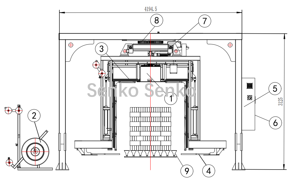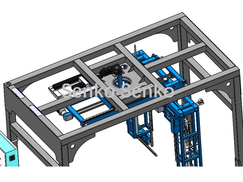 مع ثبات كومة الطوب/الكتل، ينزلق رأس التعبئة وفتحة الرافعة على الإطار ذهابًا وإيابًا لربط العناصر أفقيًا بأشرطة PET. ثم يدور رأس التعبئة وفتحة الرافعة بزاوية 90 درجة لربط العناصر رأسيًا بأشرطة PET.