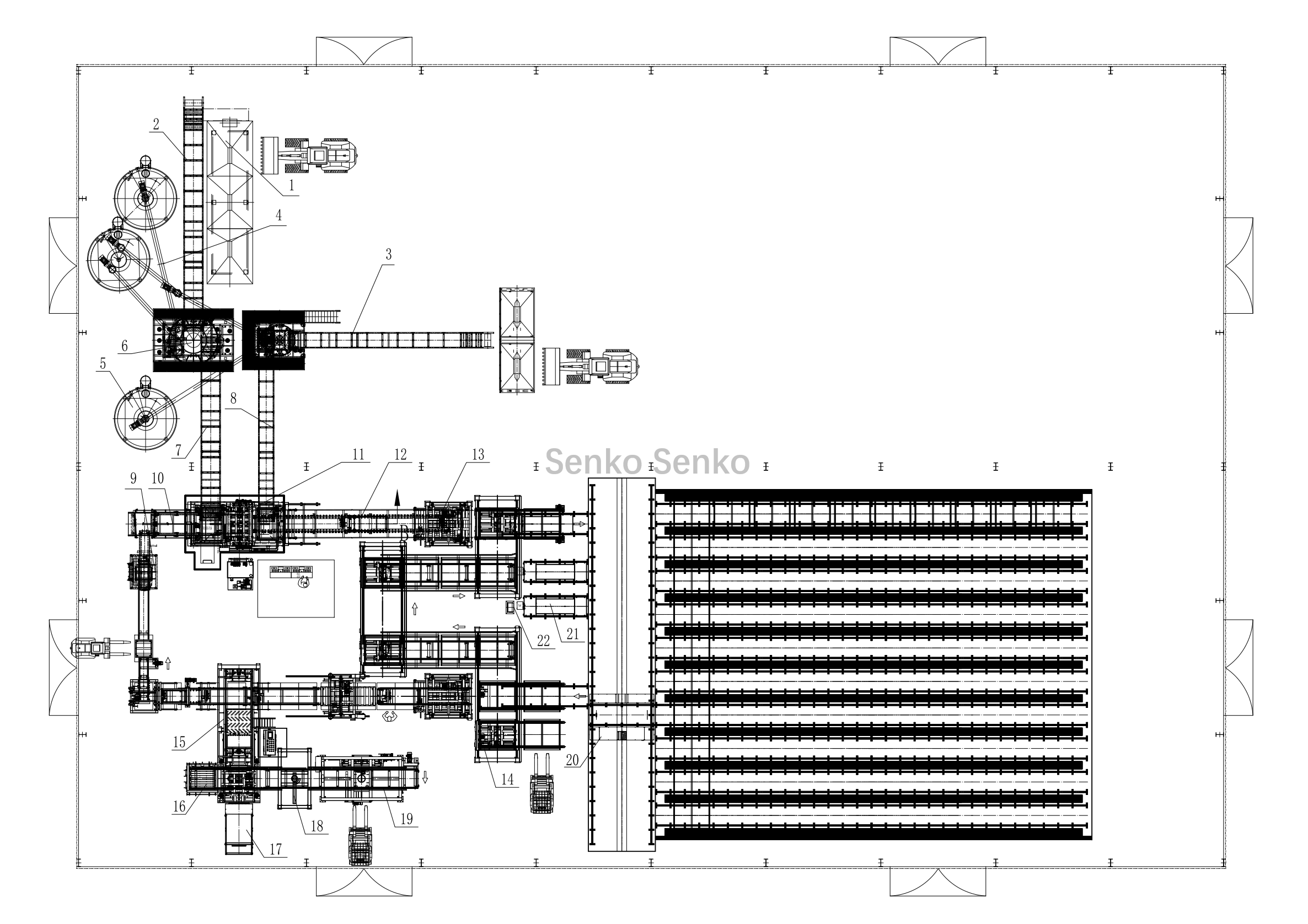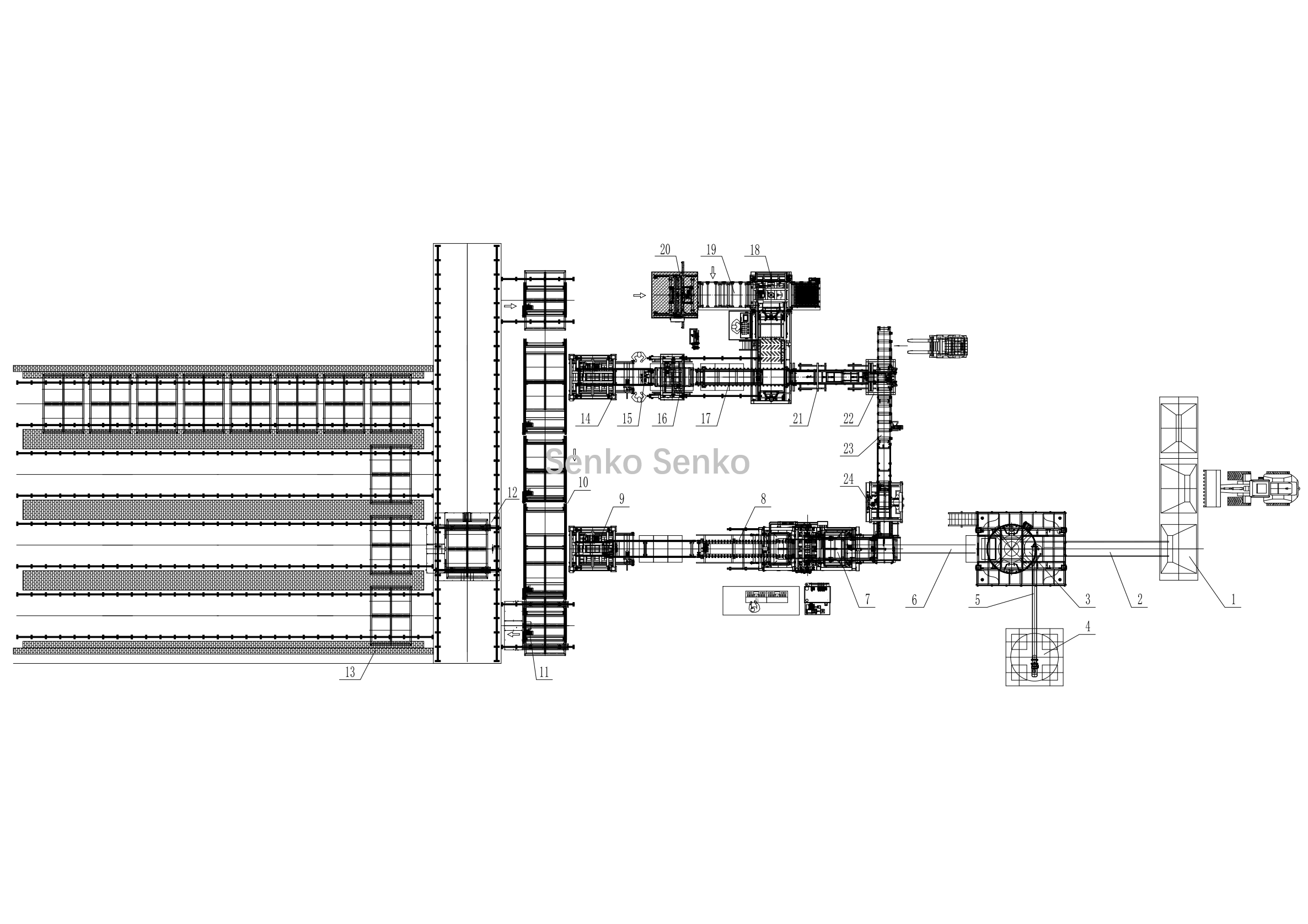 | 19، ناقل المكدس | 20، آلة تجريد التعبئة والتغليف | 21، ناقل المنصات الفارغة | 22، آلة التكديس | 23، ناقل مكدس المنصات | 24، تحميل المنصات |