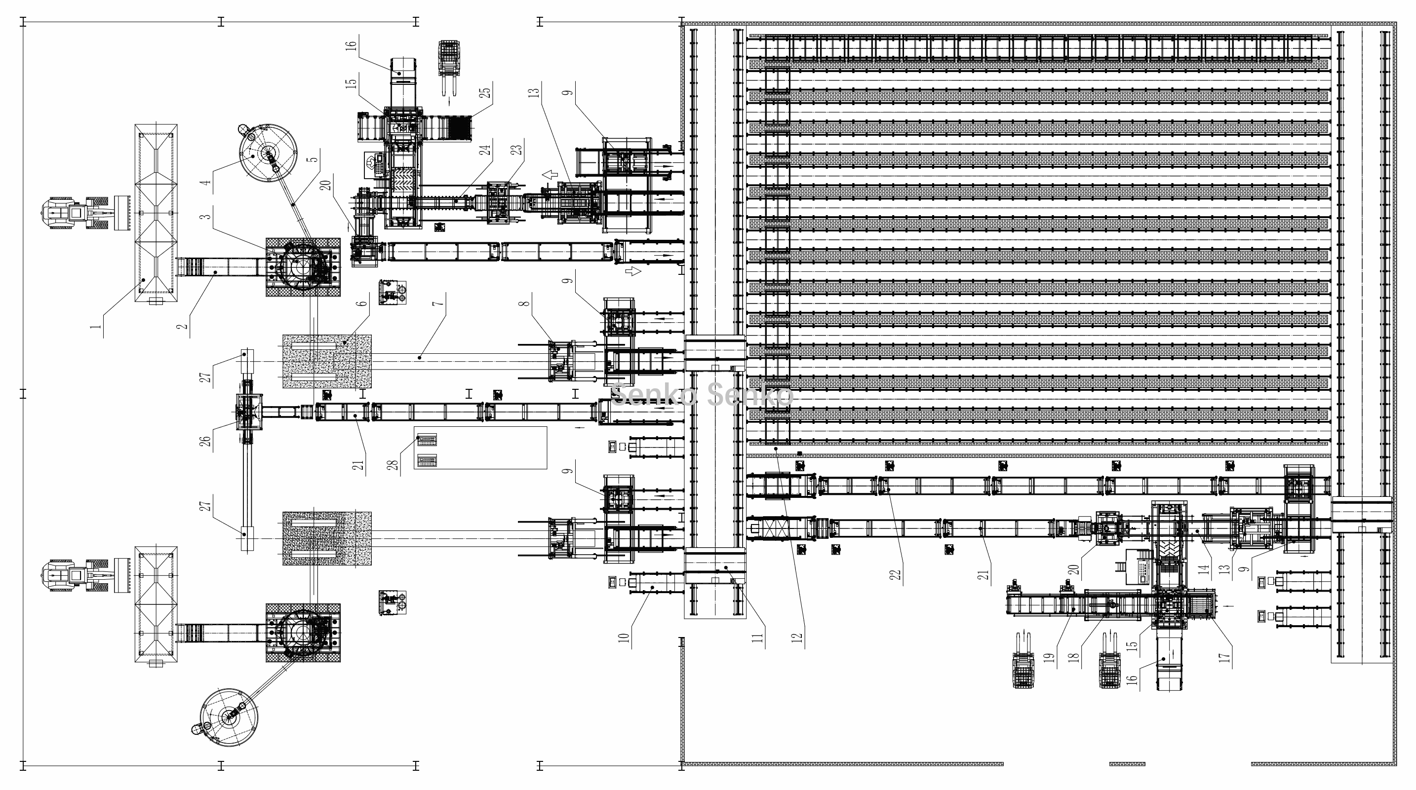 | 19، آلة تجريد | 20، منصة تحميل فارغة | 21، ناقل مكدس المنصات | 22، ناقل الرفوف الفارغة | 23، رافعة منصات الطوب | 24، ناقل منصات الطوب |